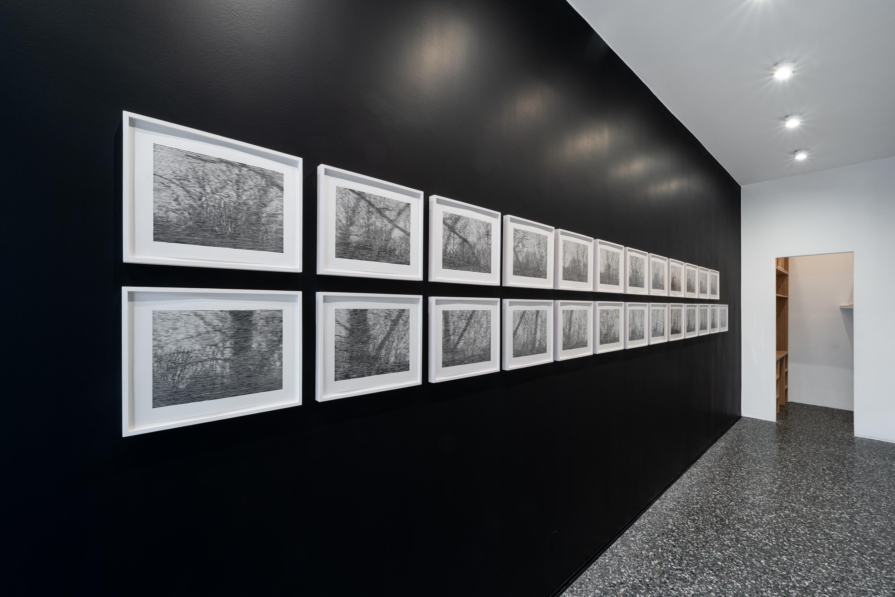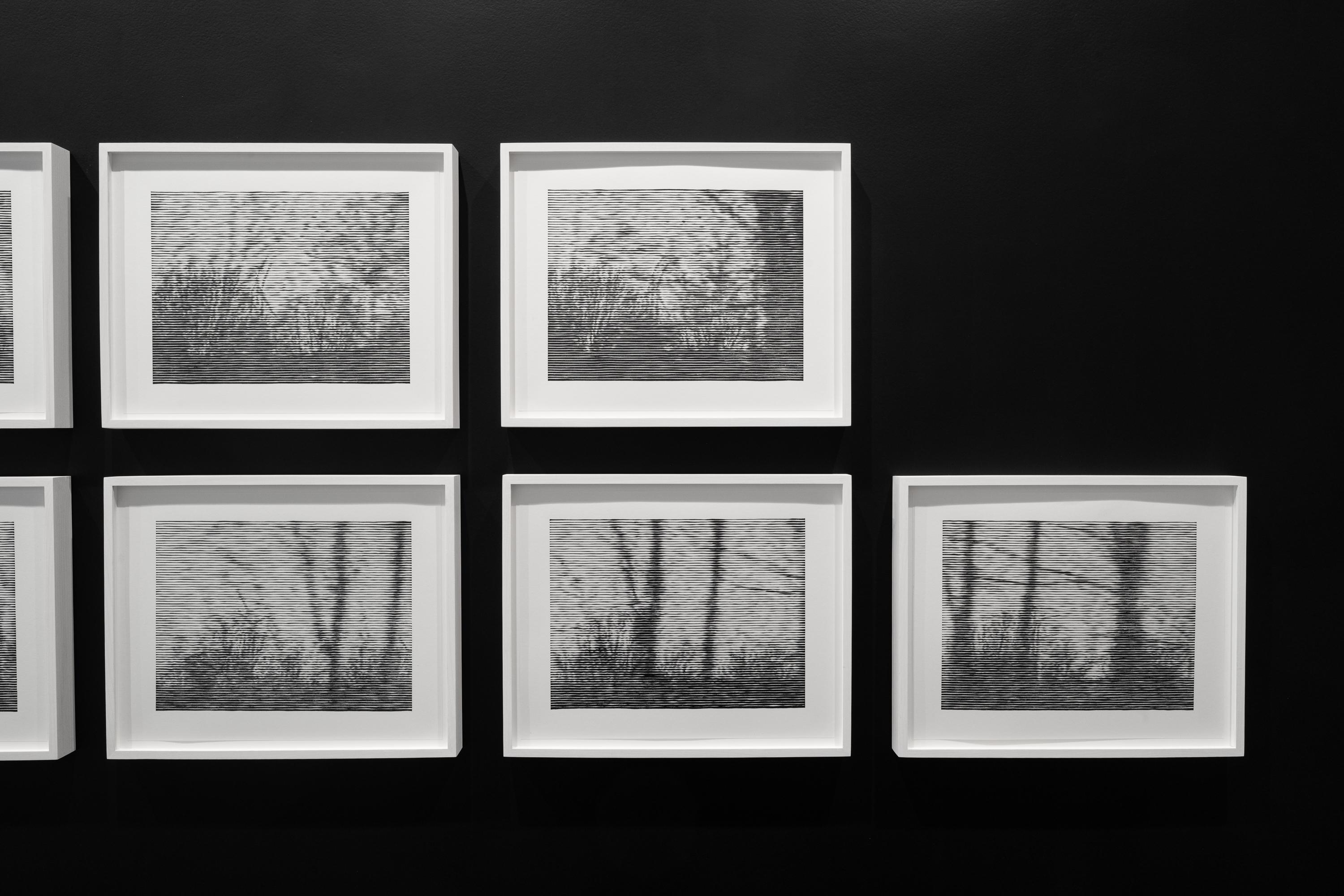 One of the central concerns in Christiane Baumgartner’s work is the tension between speed and stillness: how movement can be conveyed through a single, fixed image. In 1 Sekunde (2004), she transforms one second of video into 25 individual woodcuts, translating an ephemeral fragment of time into a tangible form. This conversion reveals an irreconcilable difference between the viewer’s perception of time and the actual temporal frame behind the work: encountering the series inevitably stretches the experience beyond one second. Distorted by motion, the passing landscape becomes an abstract sequence of horizontal lines that echo both the linearity of her woodcuts and the flicker of a cathode-ray screen. Presented in sequence, the prints reconstitute the sensation of movement – the fleeting rhythm of a landscape seen from a moving car – giving way to a meditative reflection on nature, speed, memory, and the passage of time.