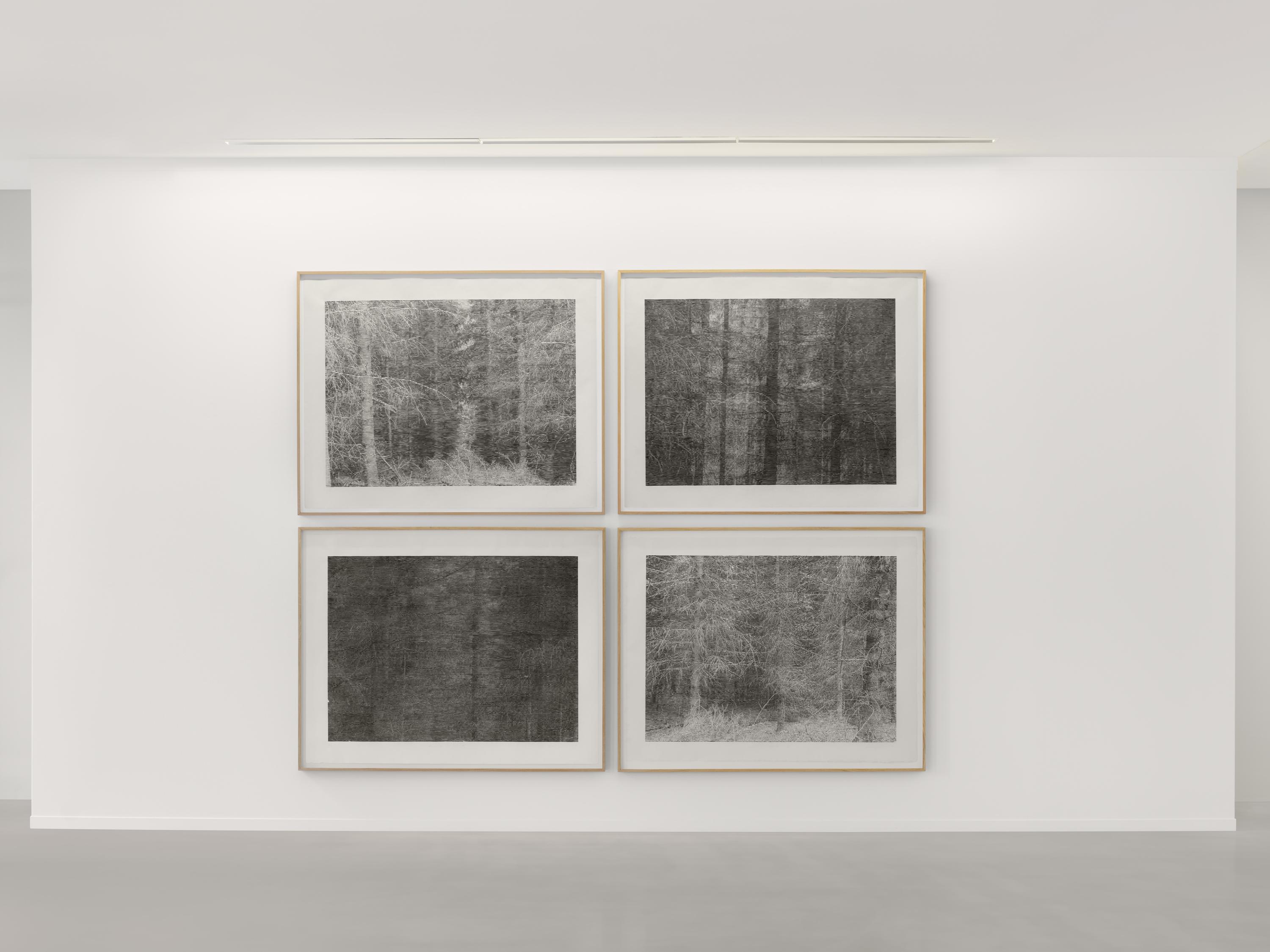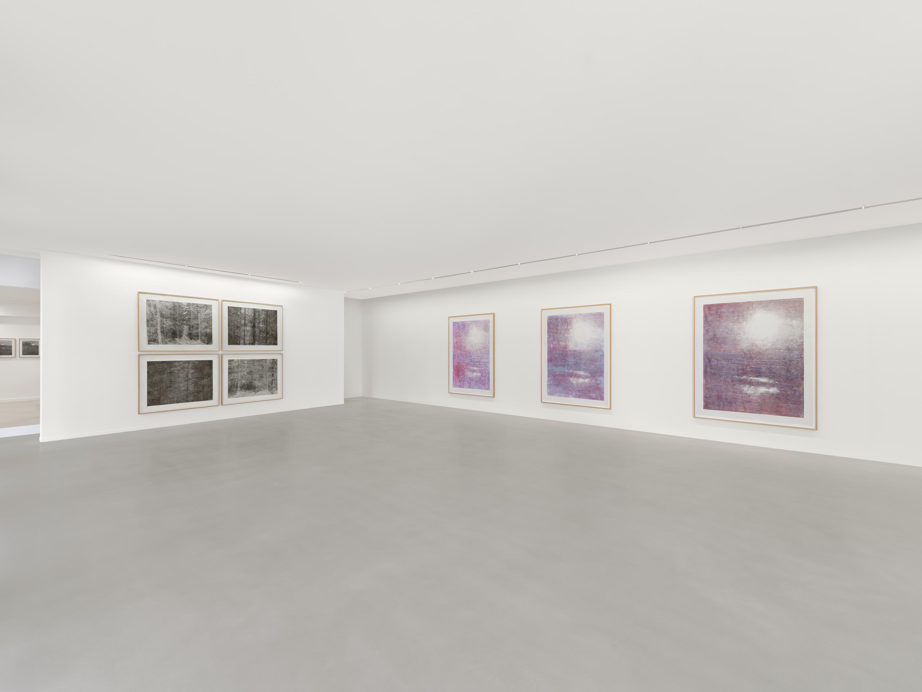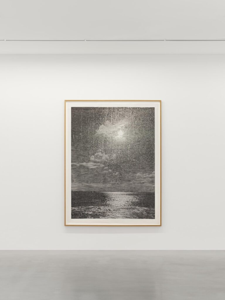 Zander Galerie is pleased to present The Long Goodbye, an exhibition of new and recent works by Christiane Baumgartner. Her large-scale woodcuts of landscapes and seascapes at dusk are based on the artist’s own video stills and digital photographs. From a distance, the images appear almost photo-graphic; up close they dissolve into finely carved grids of parallel lines, revealing the physical process of their making. Baumgartner’s practice is rooted in the translation of digital imagery into the traditional medium of woodcut. Carving line by line into large wooden blocks, she transforms fleeting moments of light and atmosphere into slow, labor-intensive prints. The resulting works move between figuration and abstraction: seascapes, skies, and reflections gradually emerge from dense linear structures that recall both analog signal patterns and the raster of digital images. By translating the fleeting image from the screen into the long and tactile process of carving and printing, Baumgartner’s large-scale woodcuts reflect on contemporary experiences of time, perception, and uncertainty.