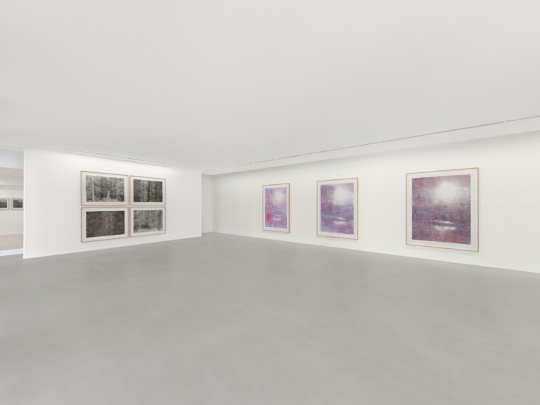Although these works may initially seem like peaceful meditations on the natural world, they mark the tensions between nature and human conflict. The exhibition‘s title refers to the artist’s latest large-scale woodcut that captures a world becoming “black and white… vague and fragile.” The Long Goodbye, 2026, is part of a series named ‘the outer world’ and represent Baumgartner’s attempt to control or preserve moments in time when the current political climate is increasingly volatile. She started this series of works in 2022, when she first heard about the Russian invasion of Ukraine. In light of this event, the artist revisited the feeling of paralysis she had experienced in her youth in Cold War-era Germany. Baumgartner’s woodcuts from her early creative period were shaped by growing up in East Germany over thirty years ago, before the fall of the Berlin Wall. For this series, Baumgartner also considered the role the sky and celestial phenomena played in medieval times, foreshadowing future events. This imposing work is based on her own photographs of the Baltic Sea, of sunsets that pierce through heavy and ominous clouds.
