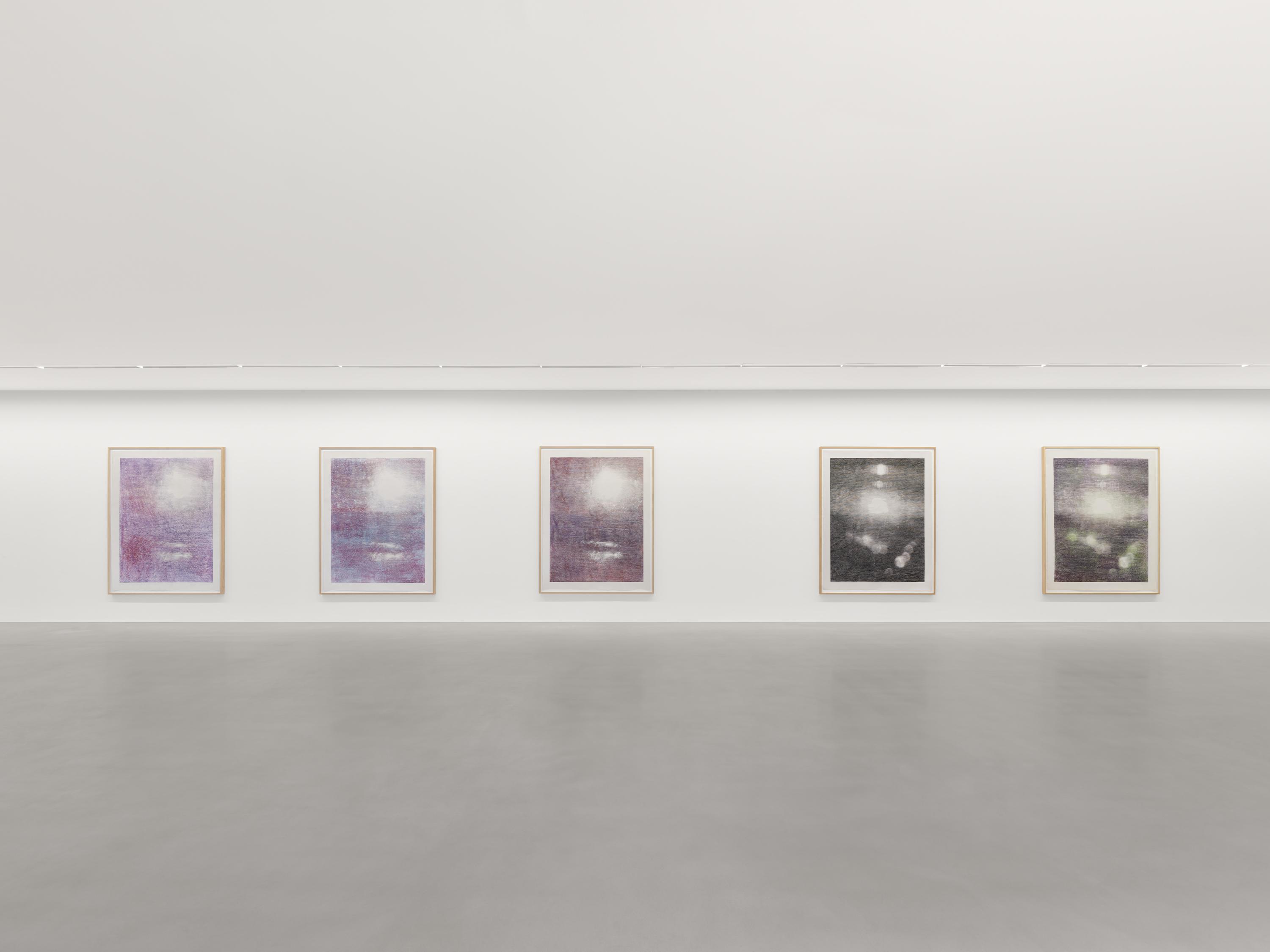 A central focus within the exhibition is on a new series of coloured woodcuts: Sunken Treasure, in which light appears glimmering luminously beneath the surface of the sea, rendered in subtle tones of violet, green, and blue. Through the pressure and layering of ink, and through selective abrasion on the verso, Baumgartner alters the printed surface so that each impression becomes subtly distinct and unique. In contrast to the works described above, Baumgartner views these prints as being more inward-looking and intended to convey a perspective from below. The artist, who has often critiqued material culture and human consumption in her practice, named the variants in this series after precious stones. Sunken Treasure – Diamonds and Sunken Treasure – Pearls are depicted in vivid colors, as the artist grapples with human ideals of beauty and value, compared to the limits and constraints of global growth.